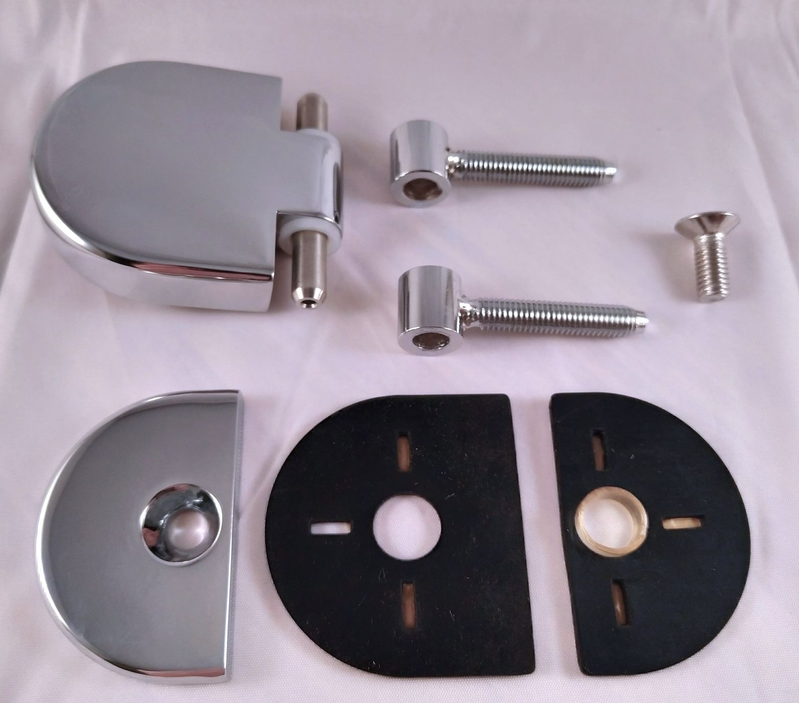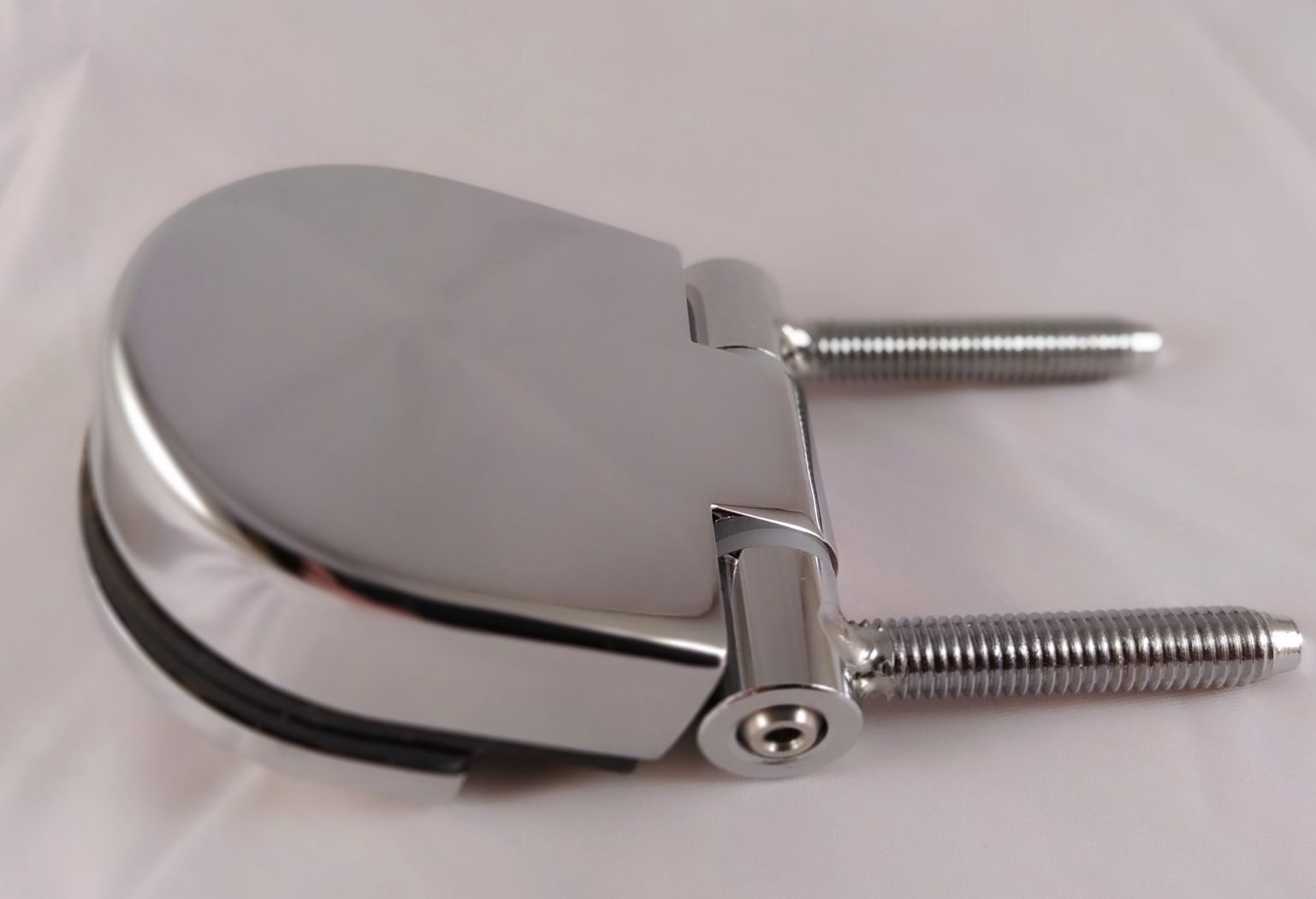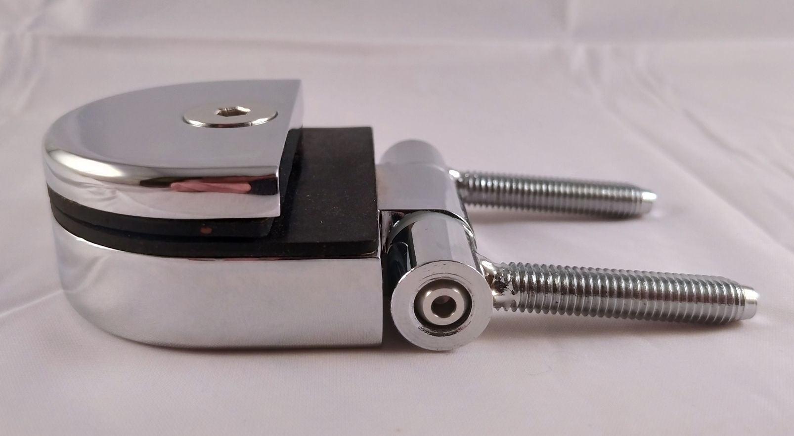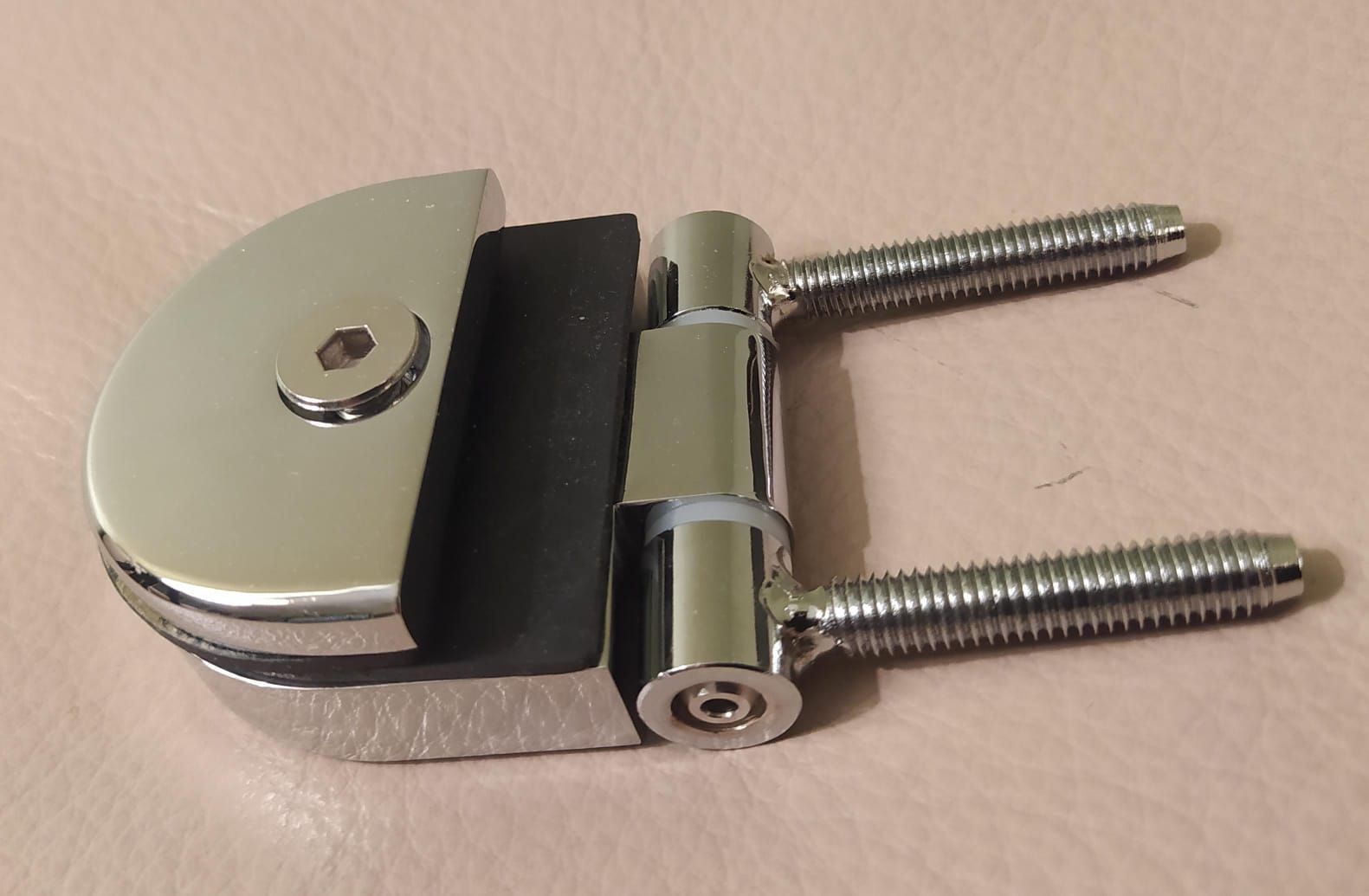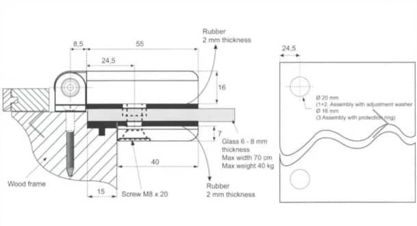Петля проста в установке: опора петли (⌀ 8мм. и длиной 40мм.) запрессовывается прессом или забивается резиновым молотков в отверстие высверленные в деревянной коробке, далее стеклянное полотно надевается на петлю.